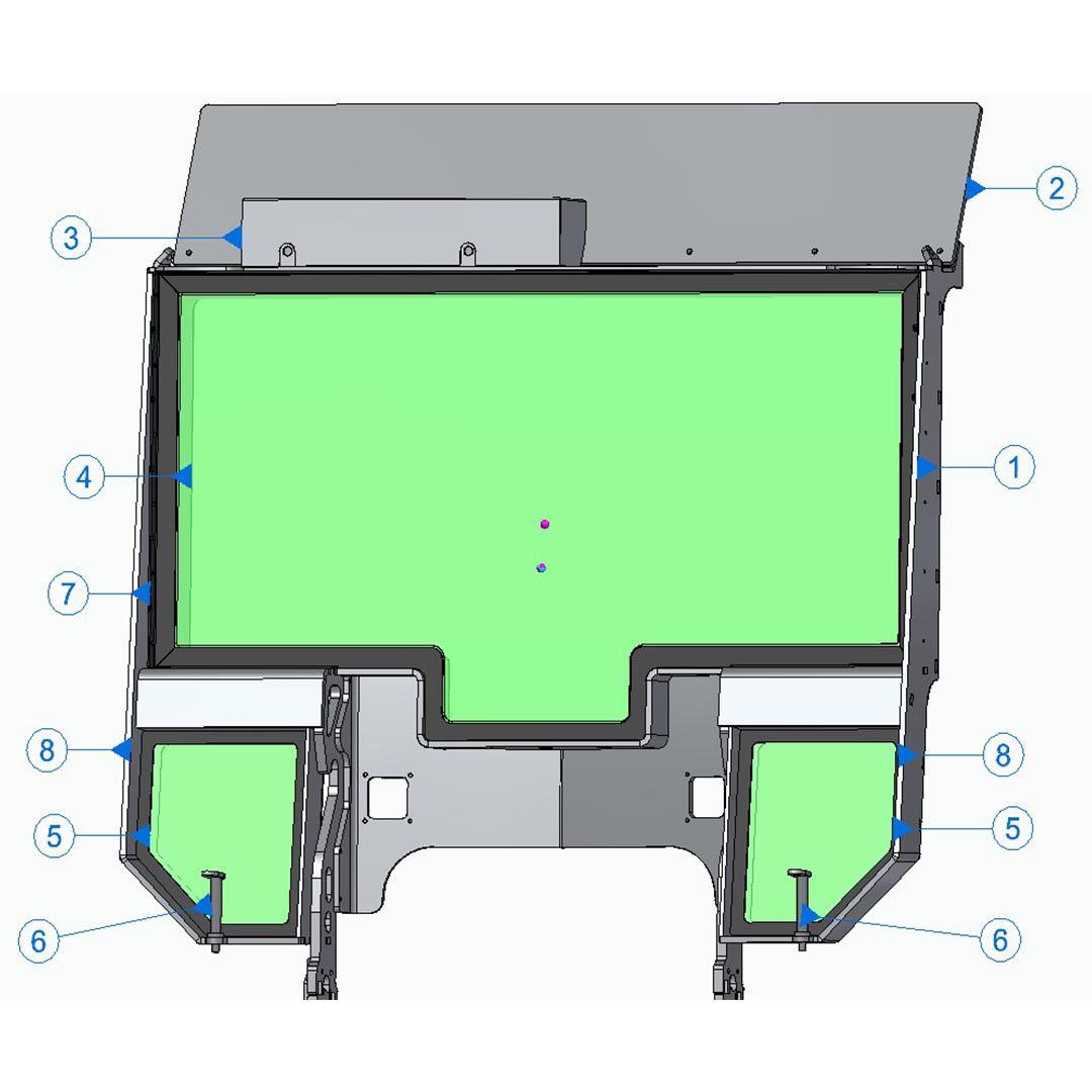 Die großflächige Ausführung in Verbindung mit den unteren Scheiben und dem oberen Abweisblech gewährleistet maximale Sicherheit für den Fahrer, auch bei eingeschlagenem Radlader.